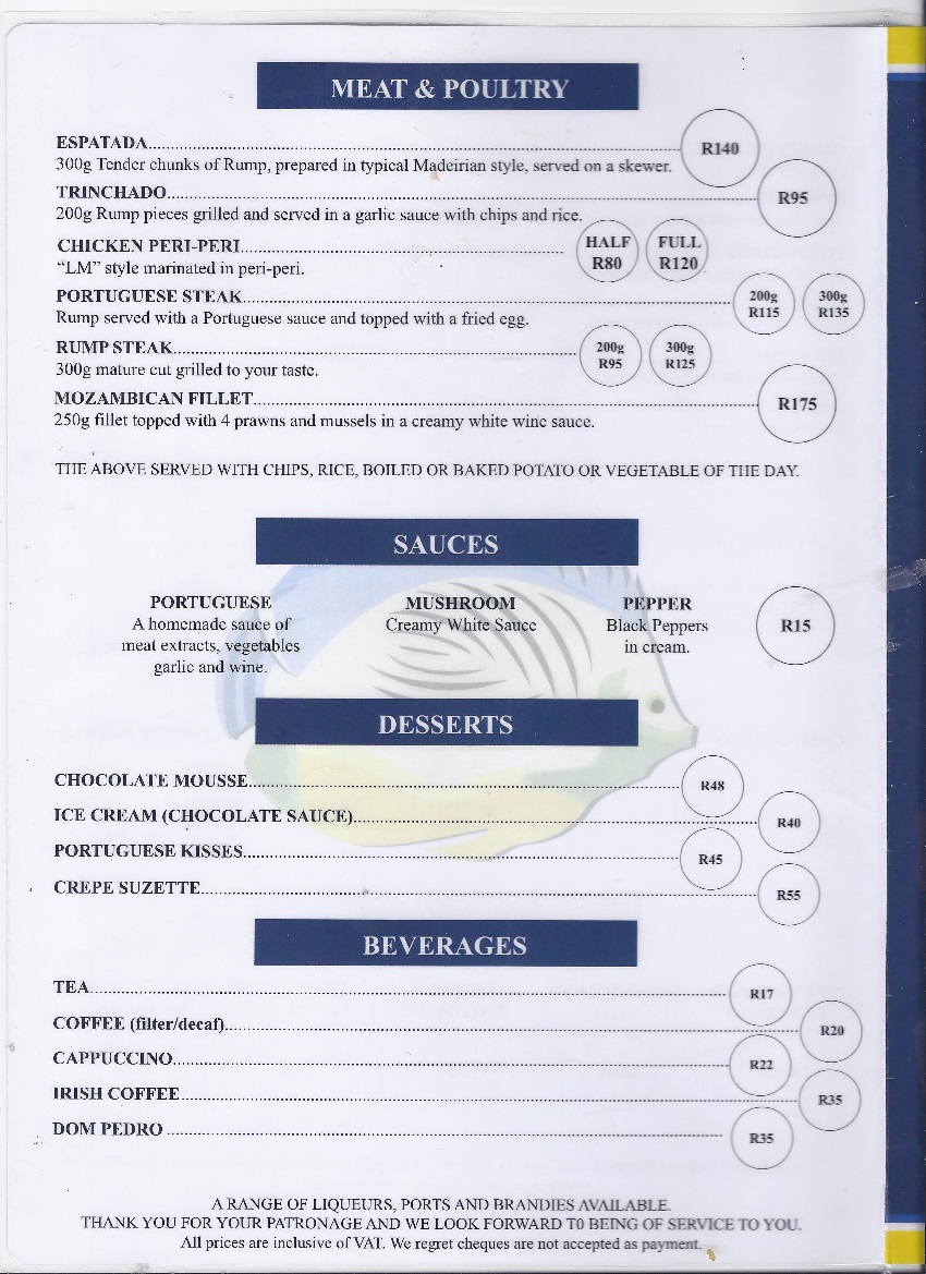 We specialize in seafood, flavoured with spices from Mozambique and Portugal